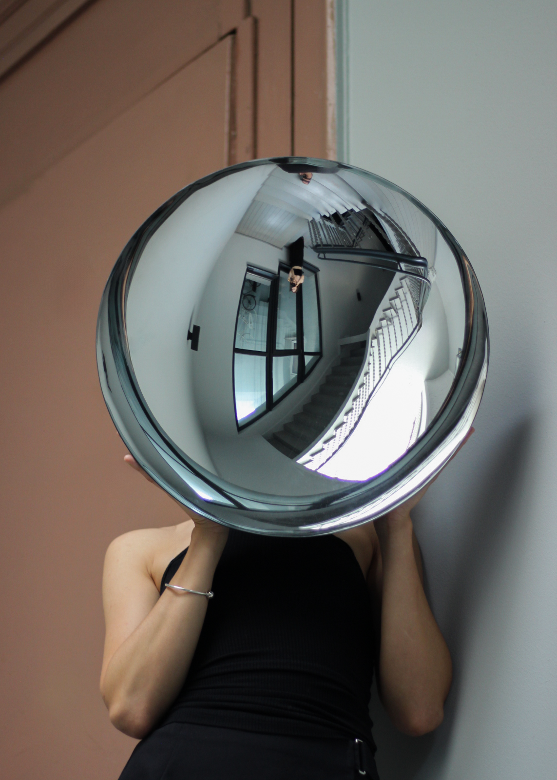 Unlike traditional glass mirrors, Disfera surfaces bend and shift, distorting reflections and changing with light and movement.